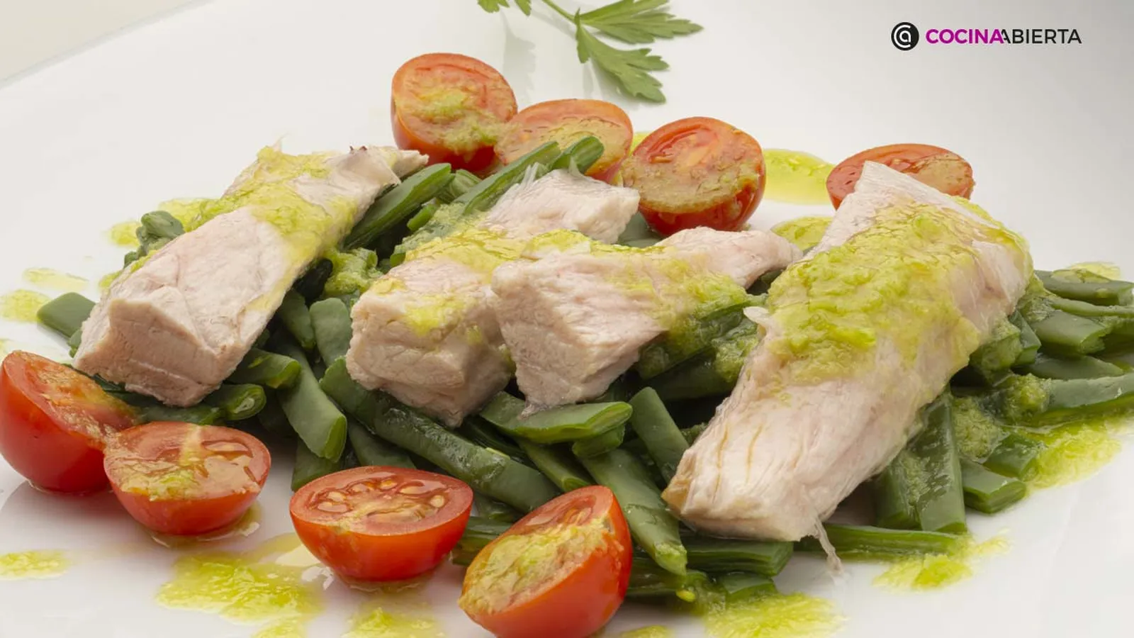 Lava los tomates cherry y córtalos por la mitad. Sirve en el centro de cada plato una cuarta parte de las judías, coloca encima unas lascas de ventresca y a los lados, los tomates cherry. Adereza las ensaladas con el aceite de pimiento y ajo. Adorna los platos con unas hojas de perejil.