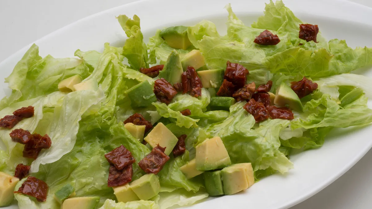 Ensalada de lechuga, aguacate y tomates deshidratados