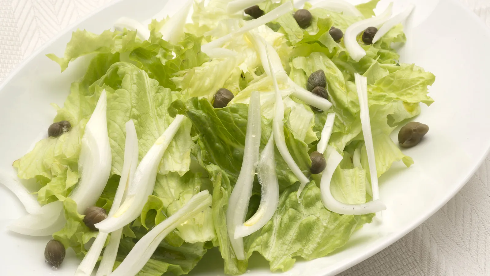 Karlos Arguiñano prepara una ensalada de lechuga, cebolleta y alcaparras con aceite de oliva, ideal para servir como guarnición.