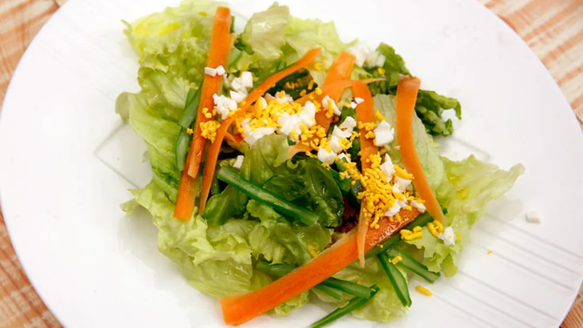 Receta de Karlos Arguiñano de ensalada de lechuga con judías verdes cocidas, tiras de zanahoria y huevo cocido, un plato sencillo de preparar, ideal para servir como guarnición.