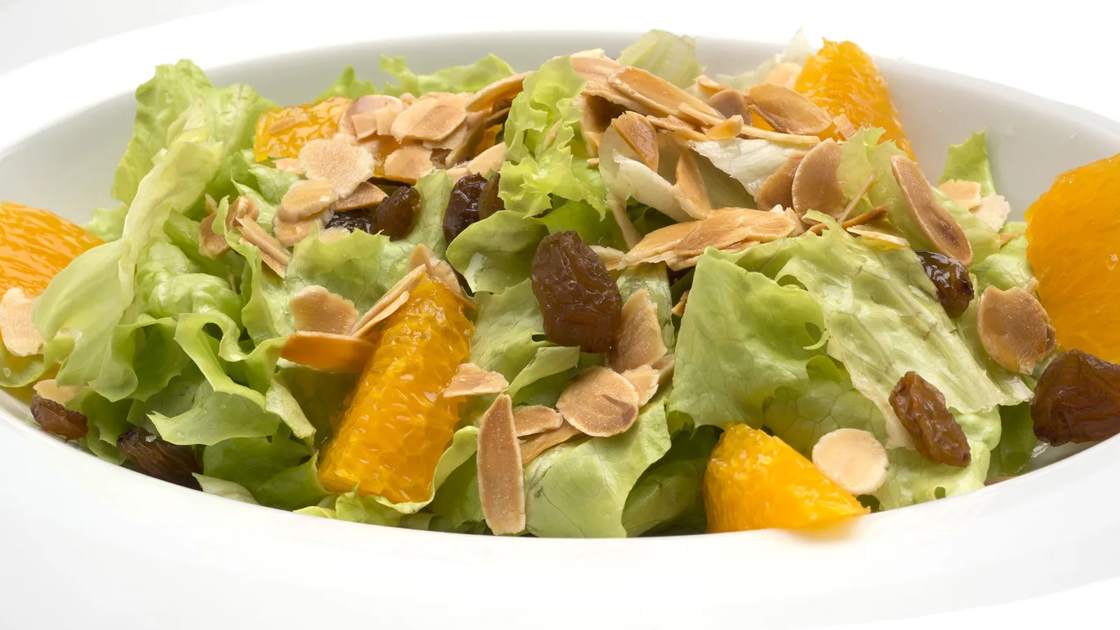 Ensalada de lechuga, naranja, almendras y pasas