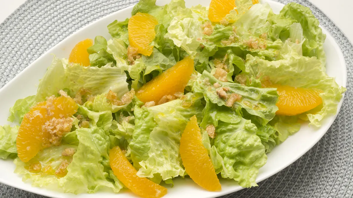 Ensalada de lechuga, naranja, cortezas de cerdo y aliño de limón, la propuesta de Karlos Arguiñano para acompañar al plato principal.
