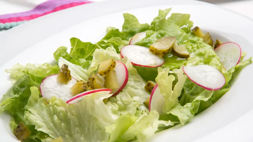 Receta de Karlos Arguiñano de ensalada de lechuga con rabanitos, pepinillos y aceite de oliva virgen extra.