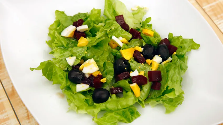Ensalada de lechuga con remolacha, aceitunas y huevo