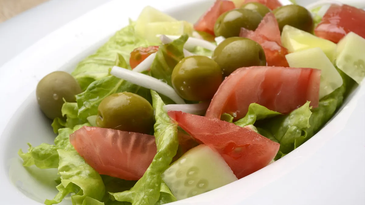 Ensalada de lechuga, tomate, pepino y aceitunas