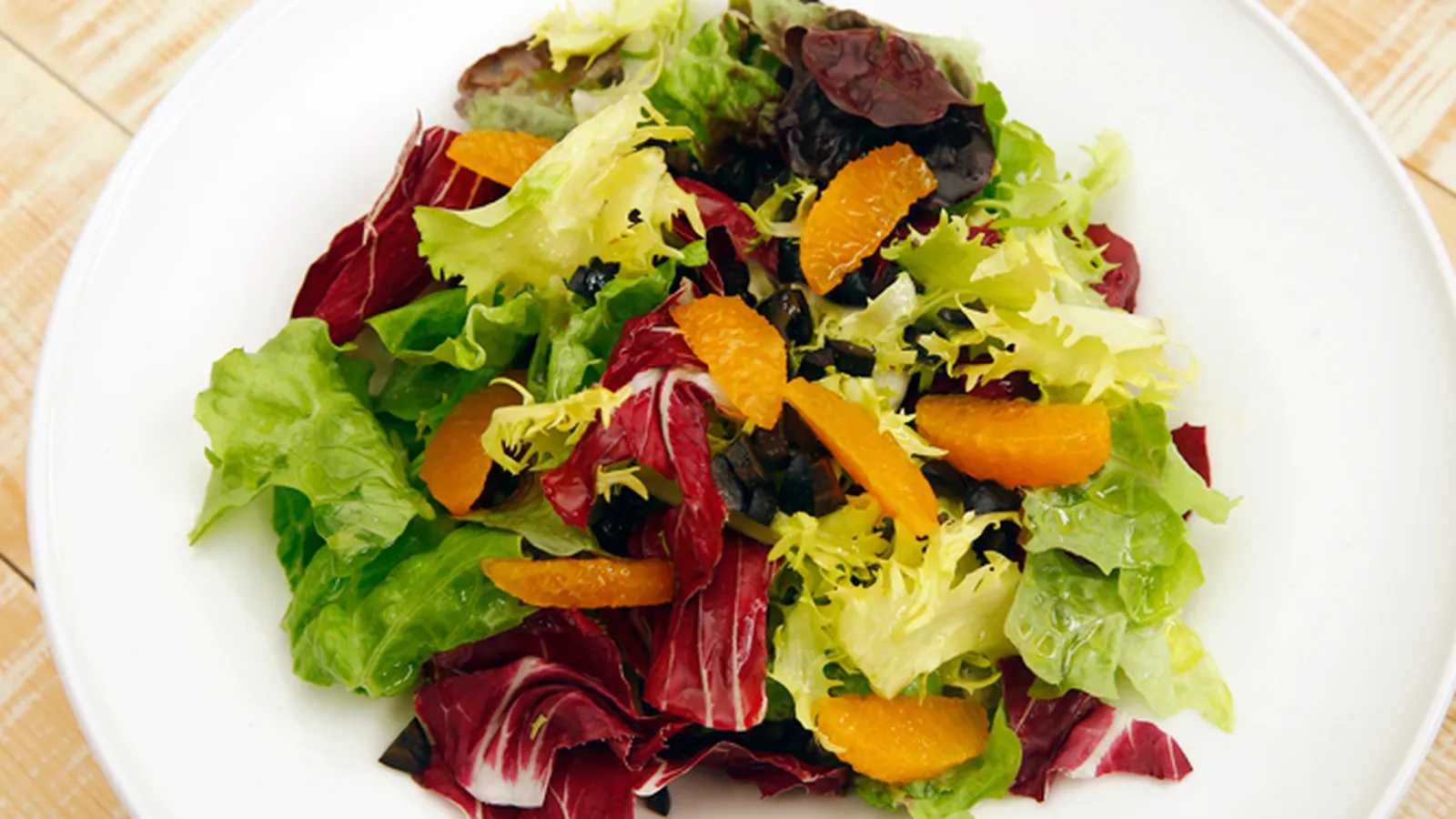 Receta de Karlos Arguiñano de ensalada de lechugas variadas con mandarina y aceitunas negras, un plato fácil, rápido y saludable para servir como guarnición. Receta apta para vegetarianos y veganos.