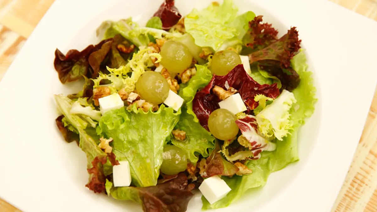 Ensalada de lechugas variadas con uvas y queso