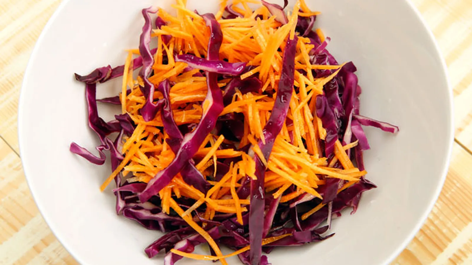 Coloca todo en un bol, y mezcla suavemente. Adereza con aceite, sal y vinagre. Sirve la ensalada de lombarda y zanahorias.