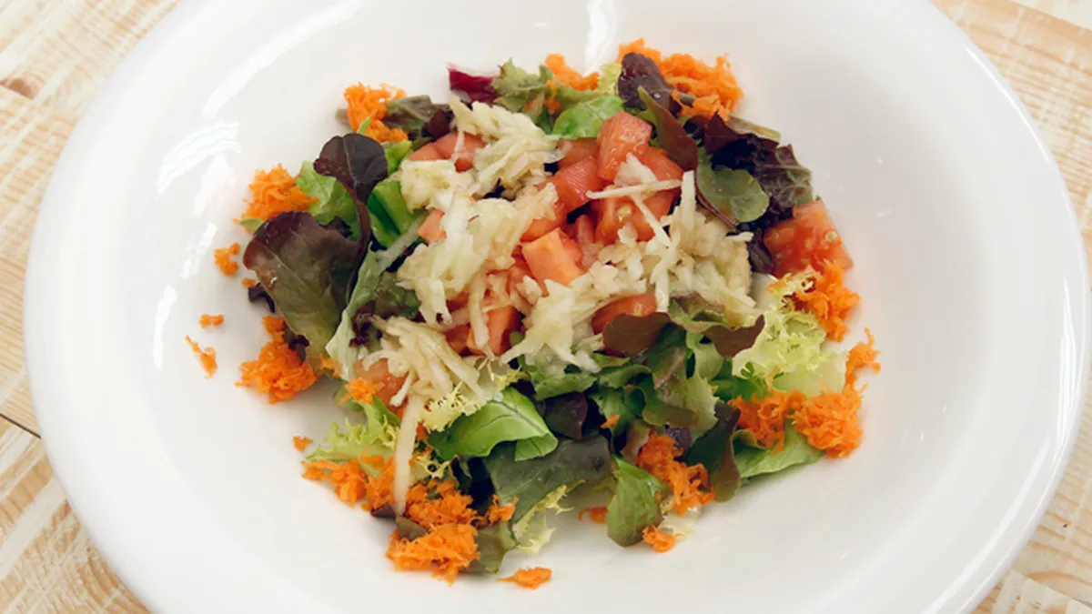 Receta de Karlos Arguiñano de ensalada de manzana y tomate con lechuga y zanahoria rallada, un plato muy fácil de preparar apto para vegetarianos y veganos.