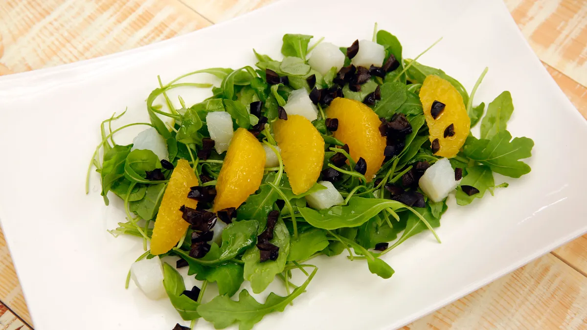 Receta de Karlos Arguiñano de ensalada de naranja, bacalao ahumado, rúcula y aceitunas negras, un plato ideal para la cena o para servir como guarnición.