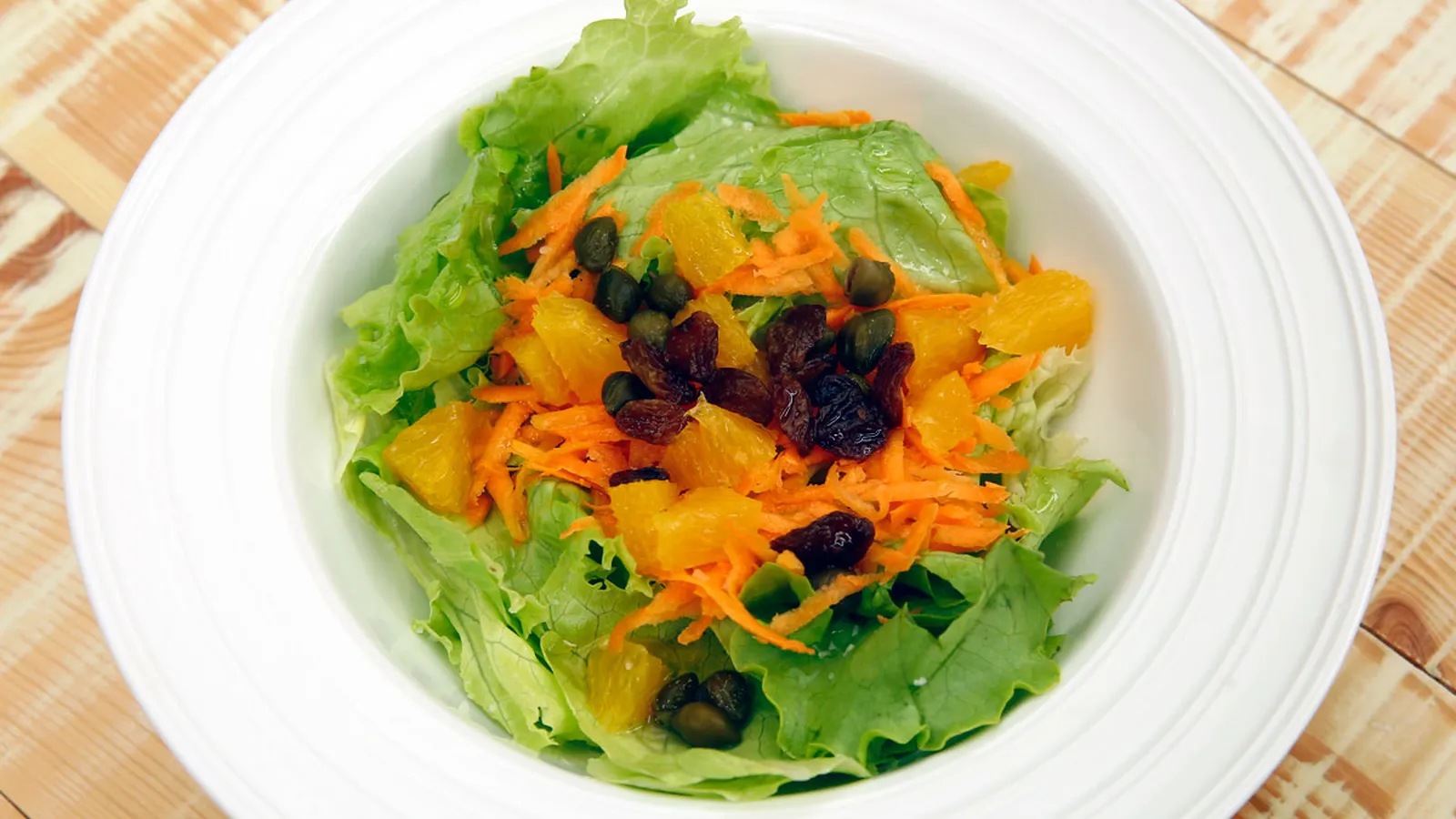 Incorpora las pasas y las alcaparras. Sazona y adereza con aceite y vinagre. Sirve la ensalada de naranja y zanahoria.