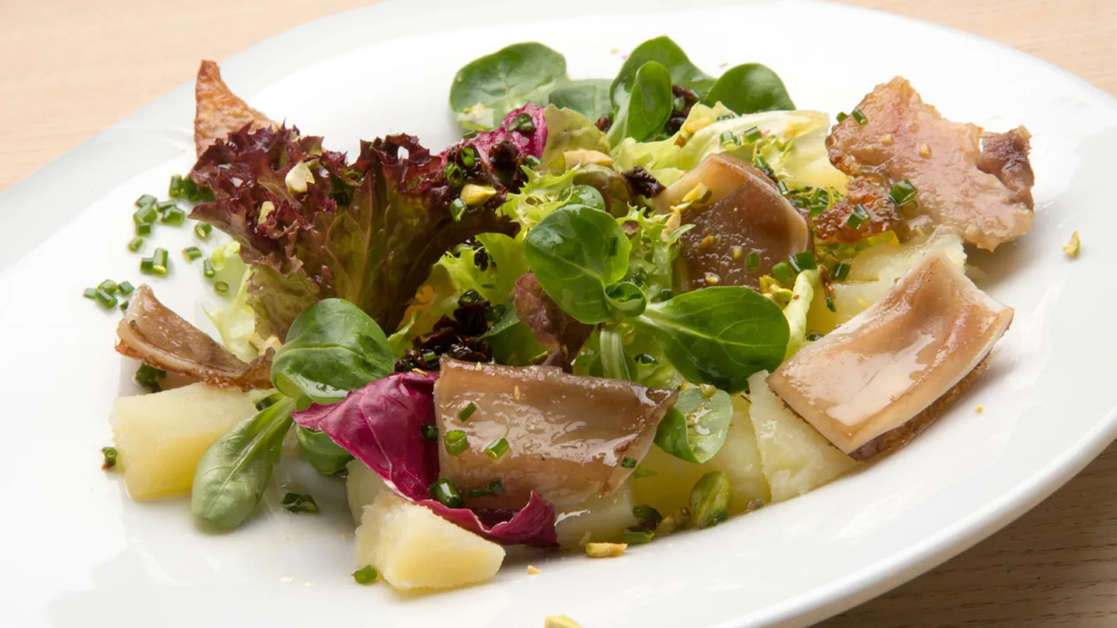 Receta de Karlos Arguiñano de ensalada de oreja de cerdo con patatas cocidas, lechuga y pistachos, todo ello aliñado con vinagreta de tomates secos.