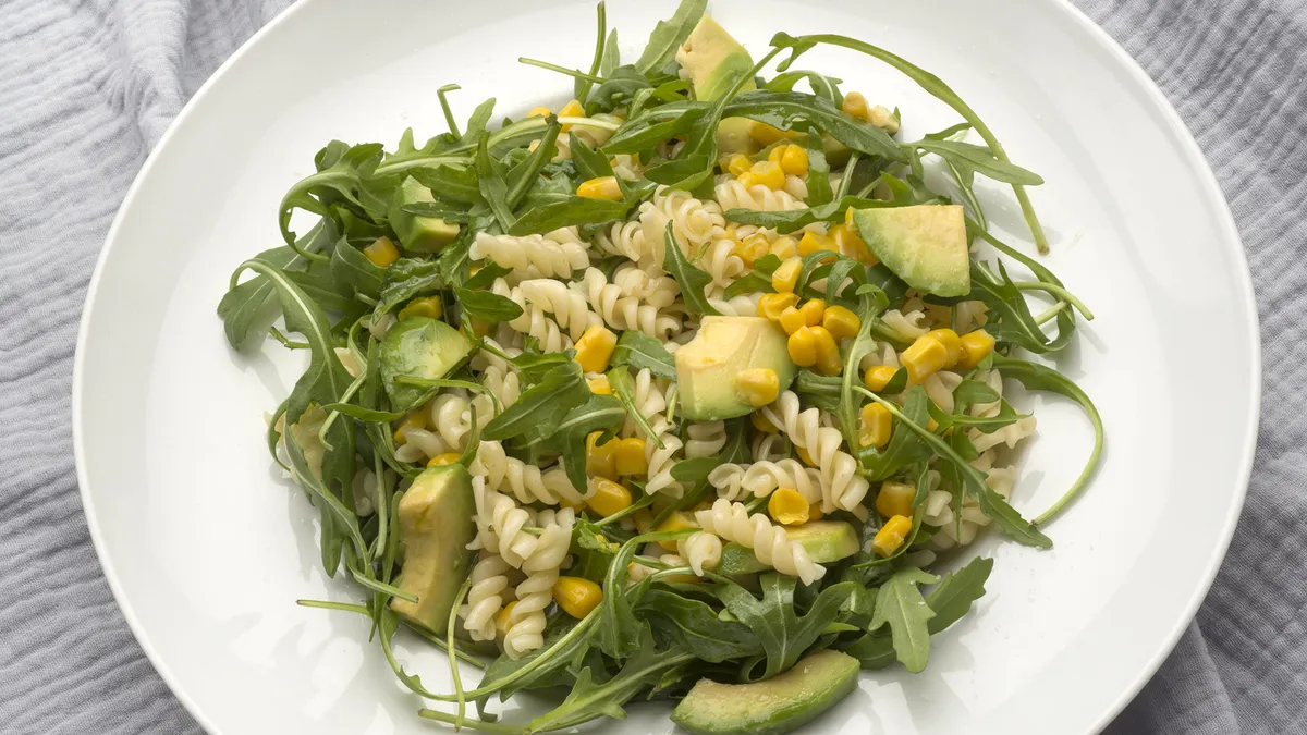 Ensalada de pasta, aguacate y rúcula