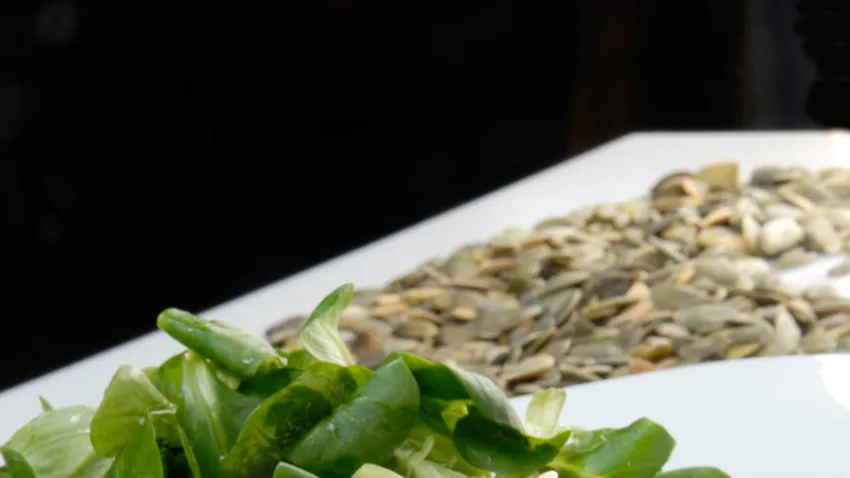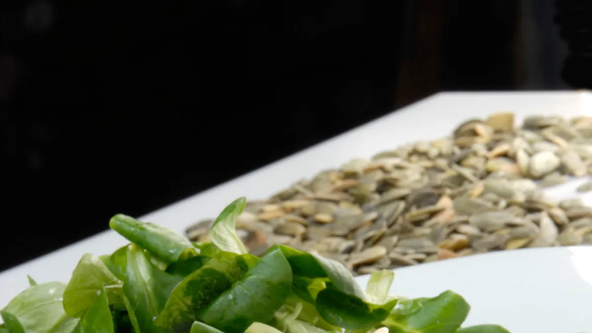 Pica las nueces y ponlas en una sartén con un chorrito de aceite. Añade las pipas de calabaza. Cuando cojan color, introdúcelos en el cuenco de la ensalada y mezcla.