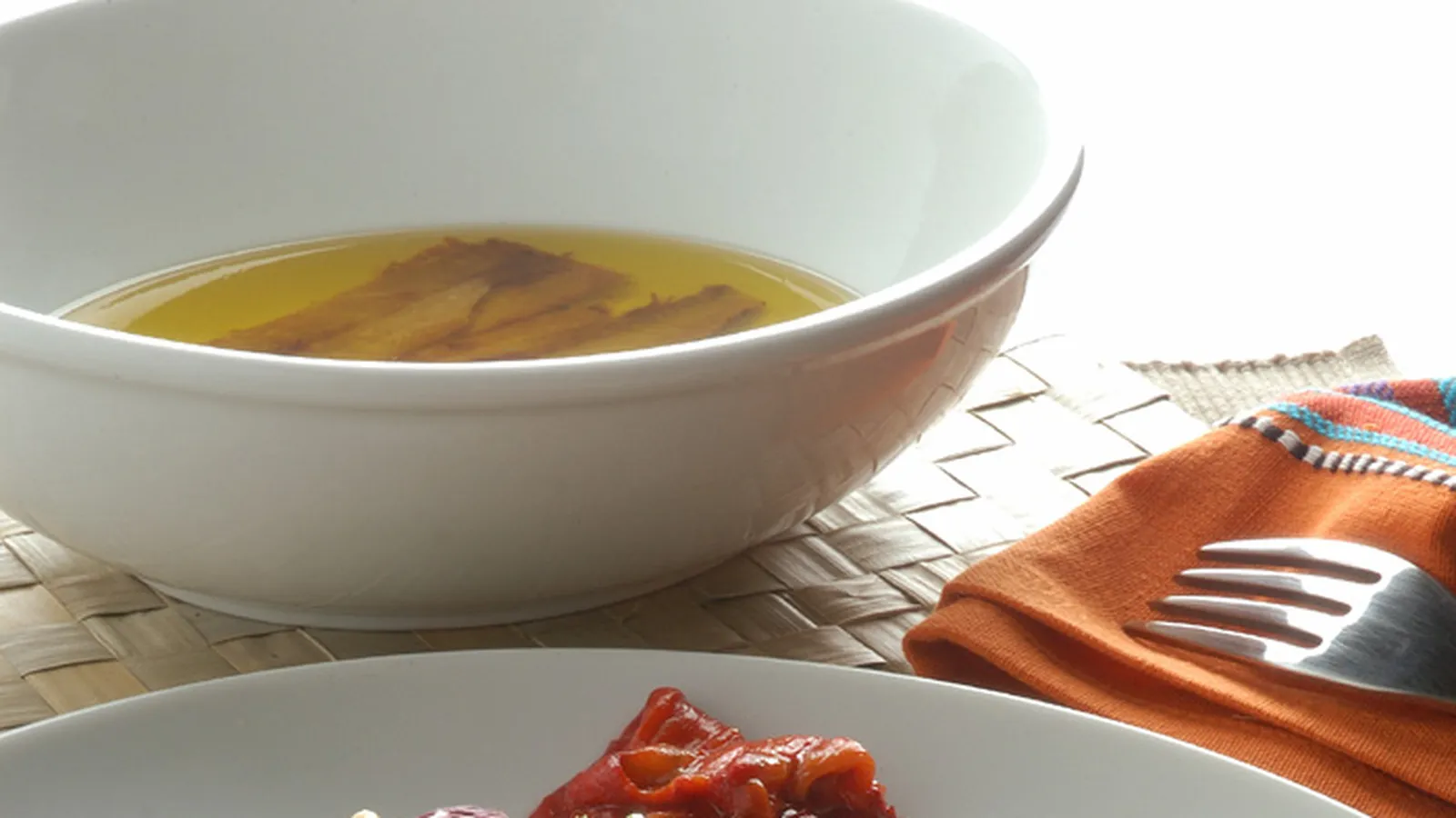 Pon los pimientos en una fuente apta para el horno. Riégalos con un poco de aceite y sazónalos. Introduce en el honro a 180ºC durante 25-30 minutos. Deja templar, pélalos y córtalos en tiras. Pica el diente de ajo finamente y añádelo a los pimientos.