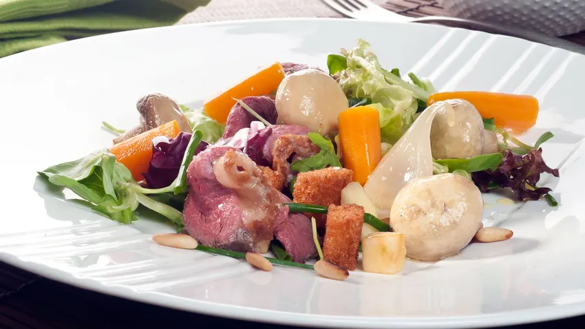Receta de Bruno Oteiza de ensalada de pato en escabeche, con champiñones, zanahorias, cebolleta, manzana, lechugas variadas y piñones tostados.
