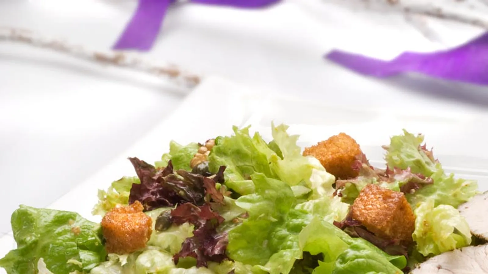 Ensalada elaborada por Karlos Arguiñano acompañada de pavo y queso y frutos secos con un mojo de anchoas y mostaza.