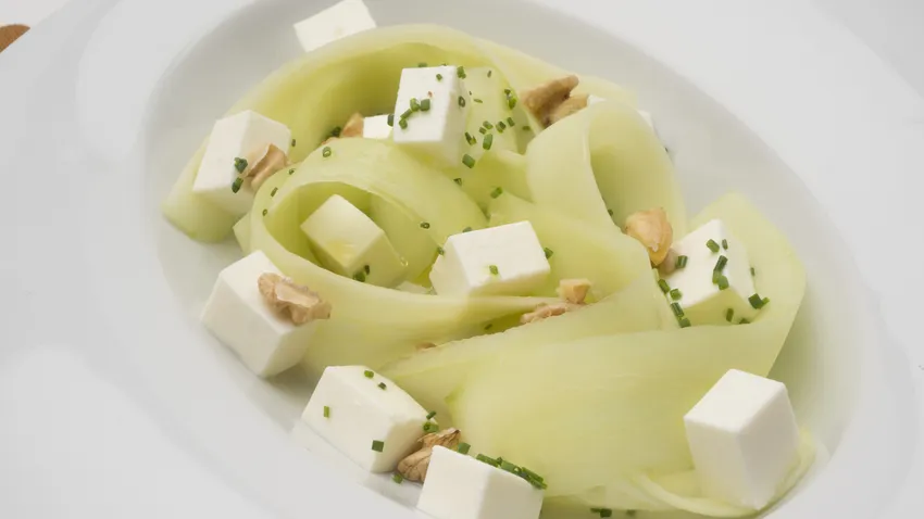 Ensalada sencilla a base de tiras de pepino con dados de queso fresco y nueces.