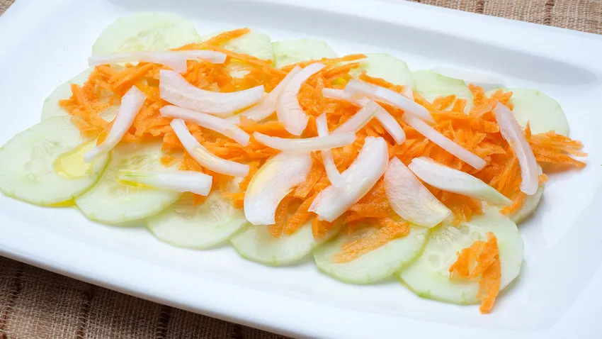 Karlos Arguiñano elabora la receta Ensalada de pepino y zanahoria como plato del acompañamiento del pricipal dentro de su programa Karlos Arguiñano en tu cocina.
