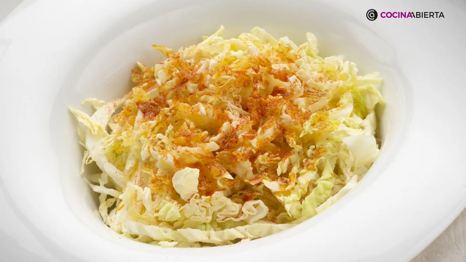 Lava la col y sécala bien con papel de cocina o un paño limpio.Córtala en juliana. Para esto, divide la col en cuatro partes y corta cada sección en tiras finas. Esto asegurará una textura agradable y que el aliño se impregne mejor.Coloca la col en un bol grande y añade una pizca de sal. Remueve con las manos para distribuirla uniformemente.