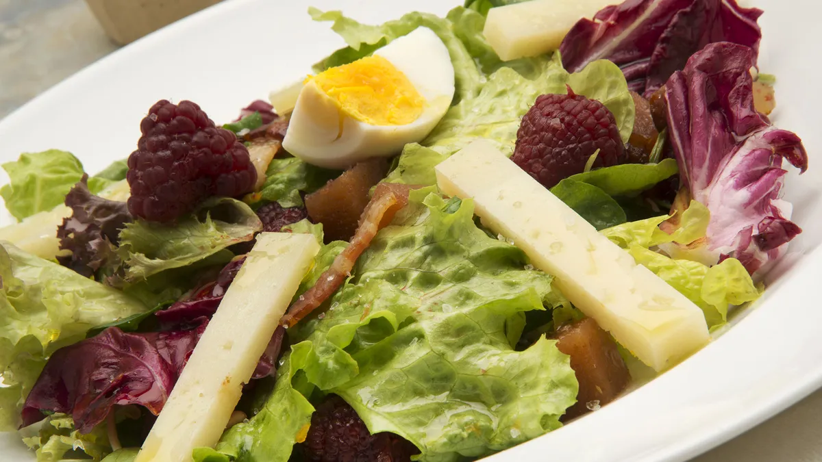 Karlos Arguiñano prepara una ensalada de lechugas variadas, queso, membrillo, taquitos de bacon, piñones tostados, huevo cocido y frambuesas.
