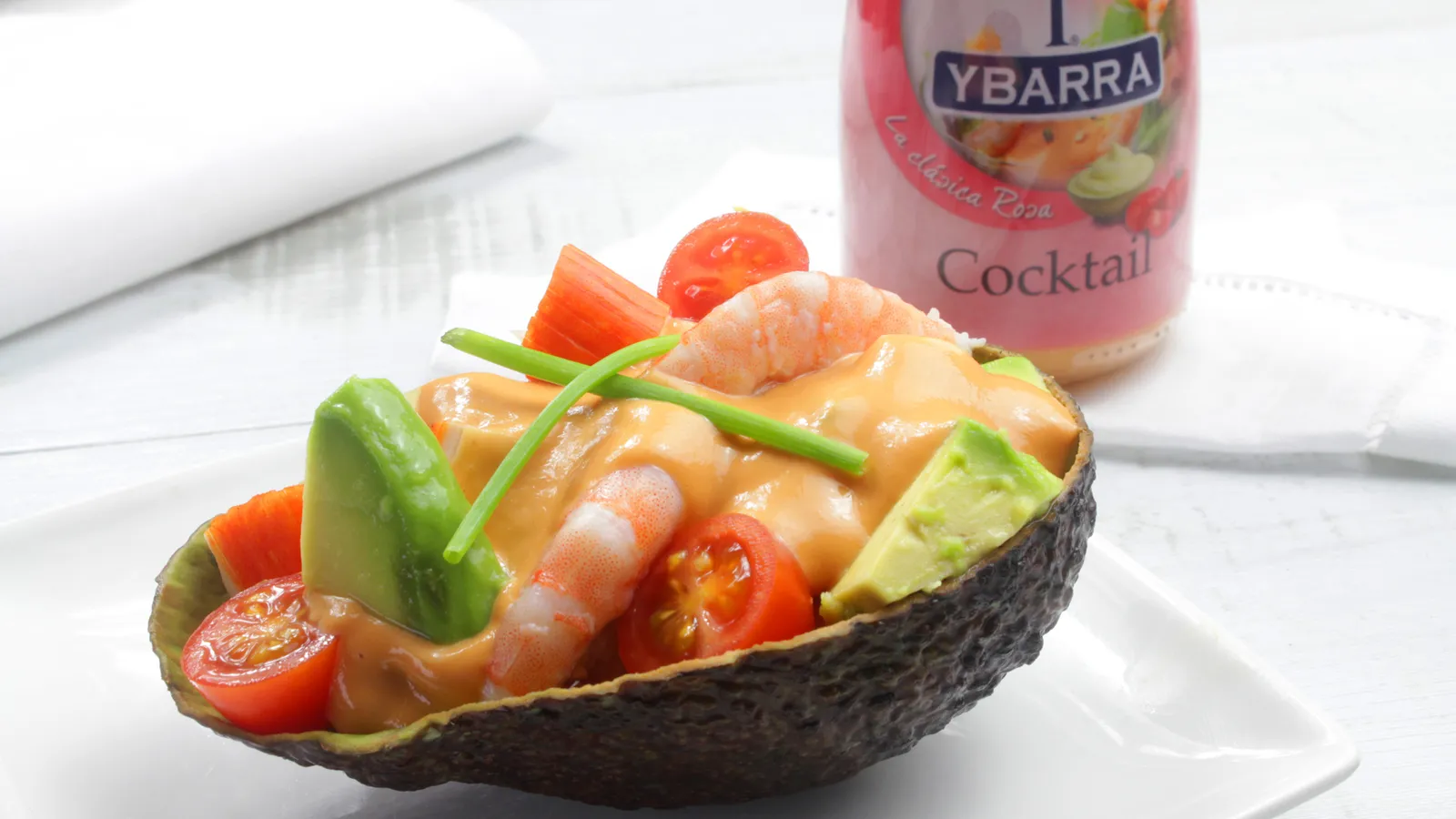 Elaboración de la receta de Aguacate relleno de marisco y salsa cocktail: