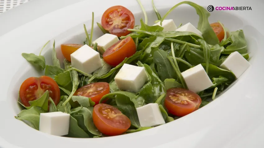 Ensalada de rúcula, cherrys y queso, receta fácil, sana y sabrosa