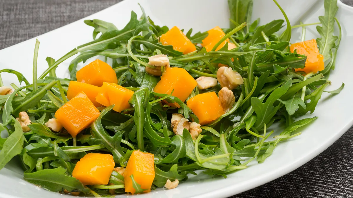 Receta de ensalada a base de rúcula, dados de mango, y nueces aliñada con una vinagreta tradicional.