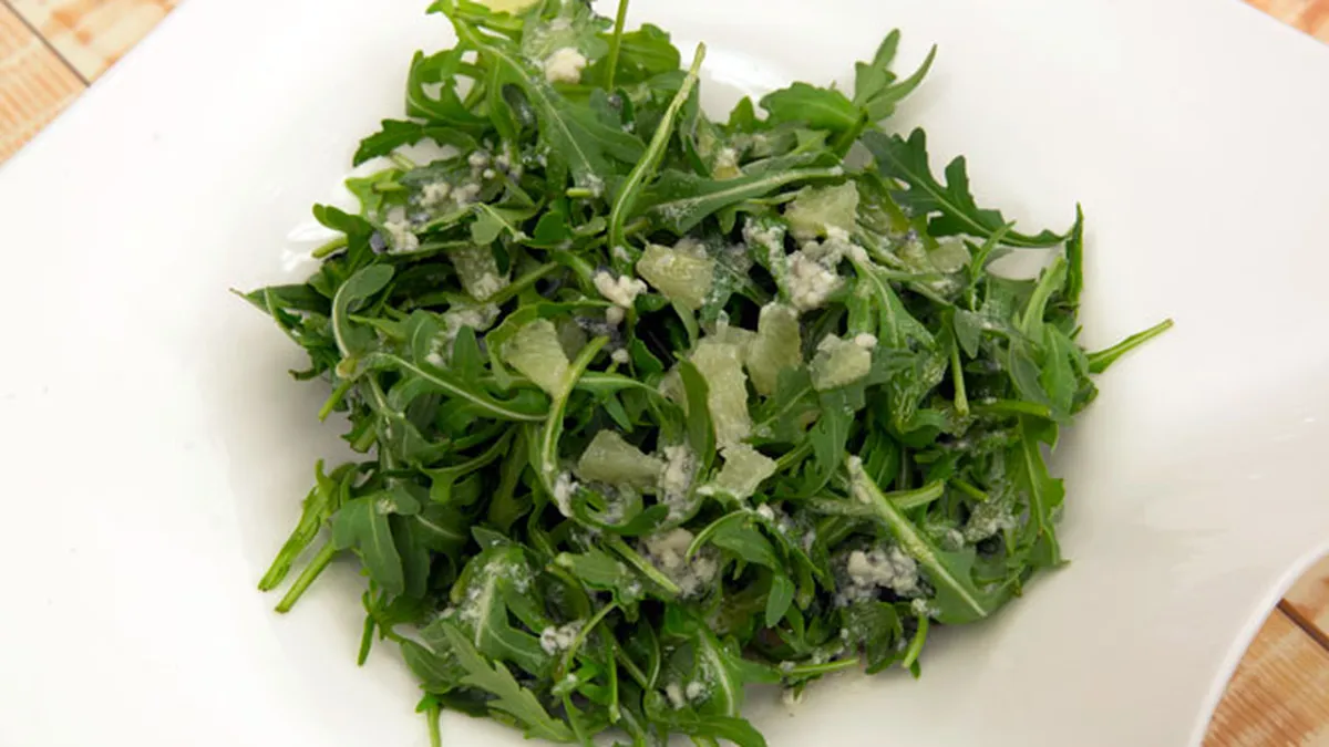 Receta de Karlos Arguiñano de ensalada de rúcula, queso roquefort y lima, un plato muy sencillo y nutritivo para servir como guarnición.