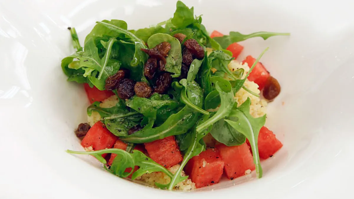 Karlos Arguiñano prepara una receta de ensalada de sandía, cuscús, rúcula y pasas, un plato saludable y muy fácil de preparar, apto para vegetarianos y veganos.