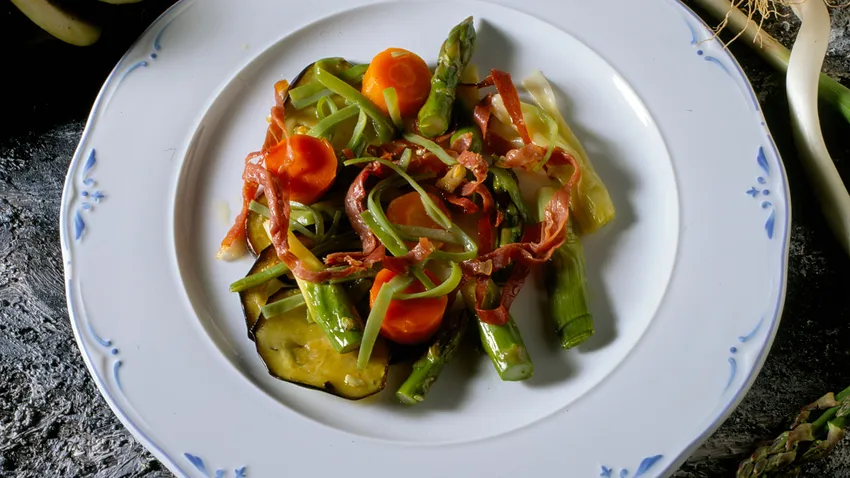 Ensalada templada de verduras de Karlos Arguiñano con calabacín, zanahorias, puerros, espárragos, vainas, berenjena y un suave refrito de ajos y jamón troceado.