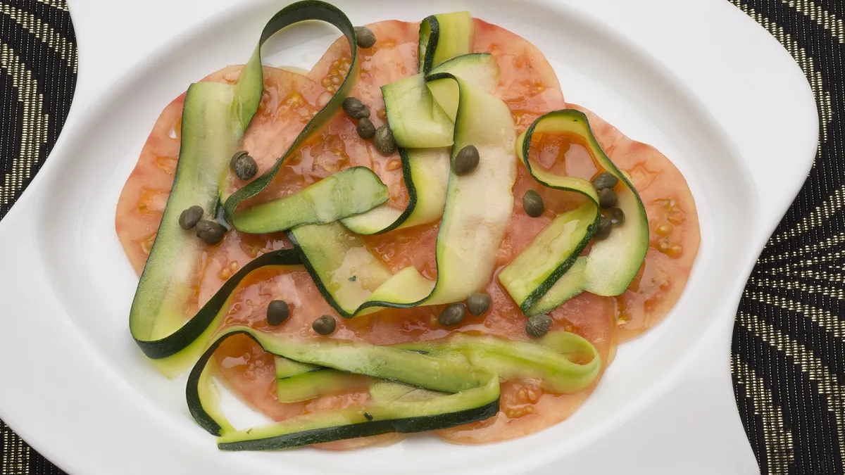 Karlos Arguiñano presenta una sencilla ensalada de tomates en rodajas acompañados de tiras de calabacín salteadas y alcaparras.