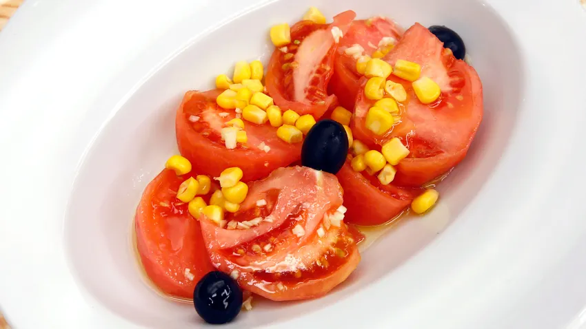 Receta de Karlos Arguiñano de ensalada de tomate, maíz y aceitunas negras con ajo picado.
