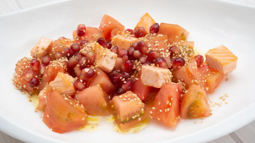 Ensalada de tomate, salmón y granada