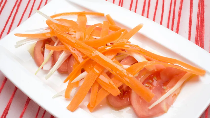 Ensalada sencilla y saludable de Karlos Arguiñano con tomate, tiras de zanahoria y cebolleta aliñada con aceite de oliva.