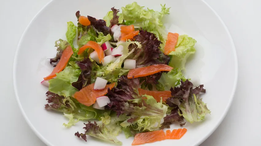 Ensalada de trucha ahumada receta elaborada por el cocinero Karlos Arguiñano en su programa principal y que sirve para acompañar al plato principal del día.