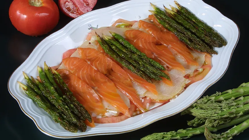 Receta de ensalada de verano con ahumados de Karlos Arguiñano, una sabrosa combinación de salmón y bacalao ahumado agregado de esparragos verdes salteados.