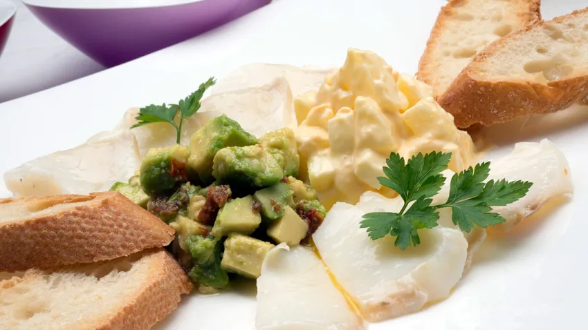 Receta de Karlos Arguiñano de ensaladilla de bacalao con patata, huevo, aguacate, tomate, pan tostado en el horno y mahonesa casera.