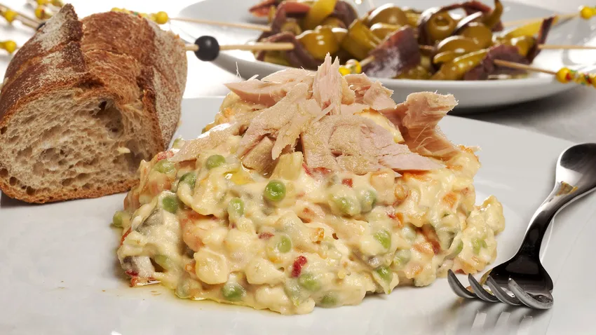Bruno Oteiza prepara ensaladilla rusa con mahonesa casera, un plato clásico que nunca falla. Para acompañar, sirve unas gildas, un pincho de anchoa, guindilla y aceituna muy típico en el País Vasco.