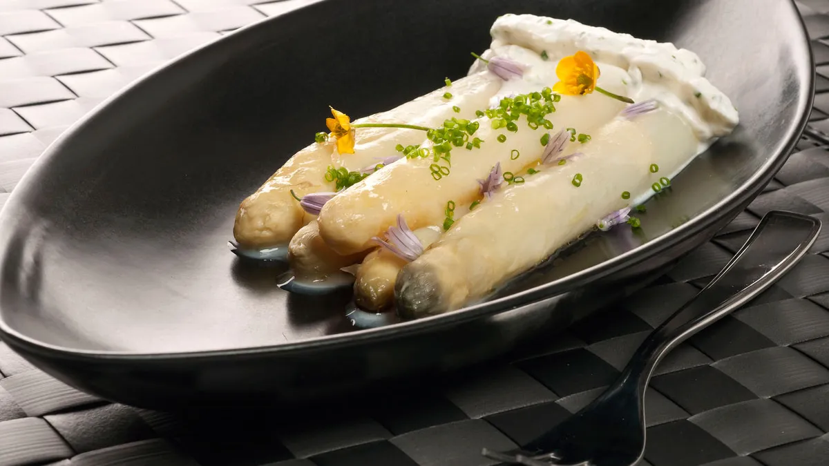 Receta de Bruno Oteiza de espárragos blancos en papillote cubiertos de queso y crema de ajo y cebollino, un plato perfecto para servir como entrante.