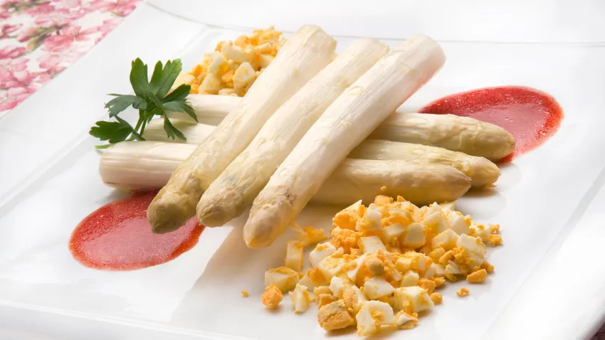 Espárragos blancos al horno acompañados de salsa de fresas, un plato vegetariano elaborado por el cocinero Karlos Arguiñano.