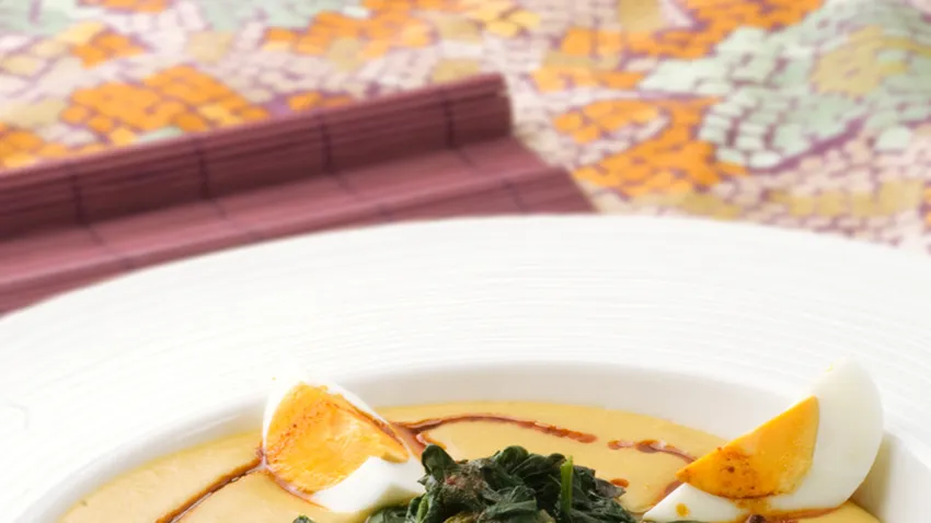 Sirve la crema de garbanzos en un plato sopero y agrega en el centro las espinacas. Coloca alrededor del plato el huevo cocido y salsea con el aceite de pimentón.