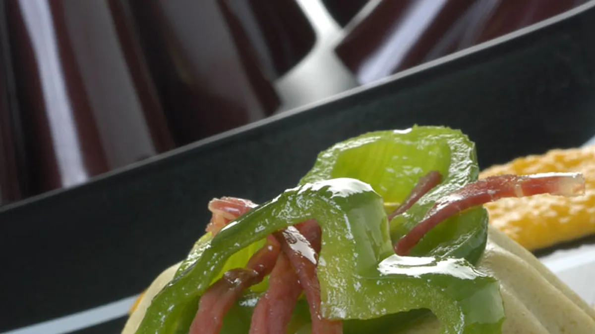 Deliciosa receta de Karlos Arguiñano del flan de calabacín y queso, acompañado de una suave crema de zanahoria y presentado con jamón serrano y aros de pimiento.