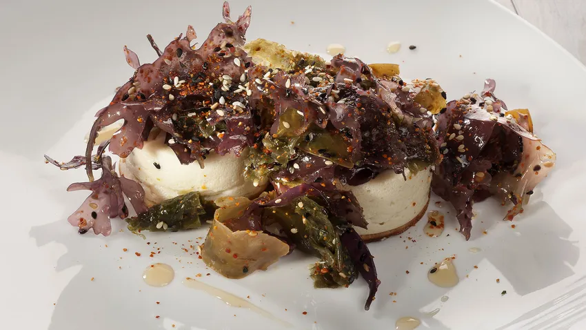 Presenta dos flanes individuales en cada plato y coloca encima un poco de la ensalada de algas. Espolvorea un poco de shichimi togarashi y de semillas de sésamo. Vierte unas gotitas de aceite de sésamo. Sirve.