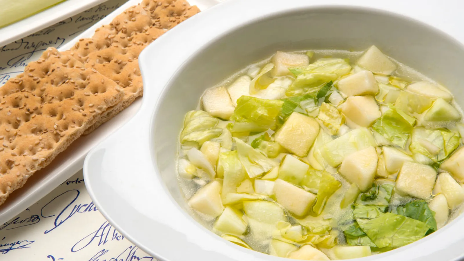 Incorpora la lechuga picadita, vierte agua fría y mezcla bien. Sirve en plato hondo.