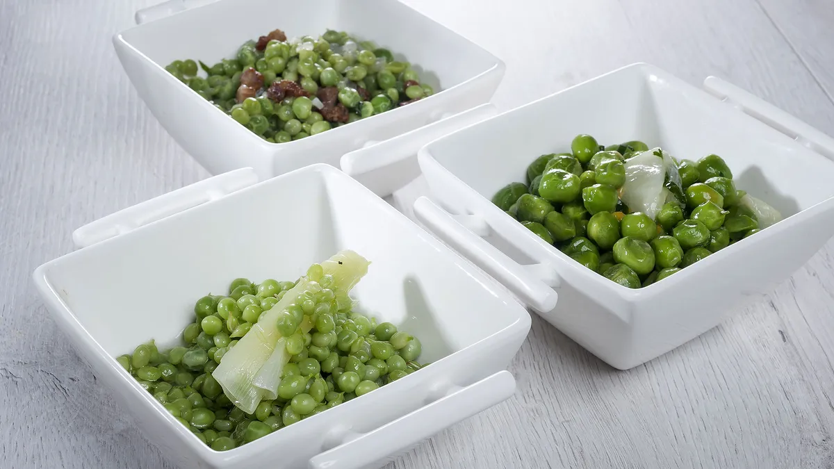Bruno Oteiza prepara tres tipos diferentes de guisantes: guisantes grandes con salsa de maracuyá, guisantes medianos con panceta crujiente y guisantes lágrima con aceite de oliva.
