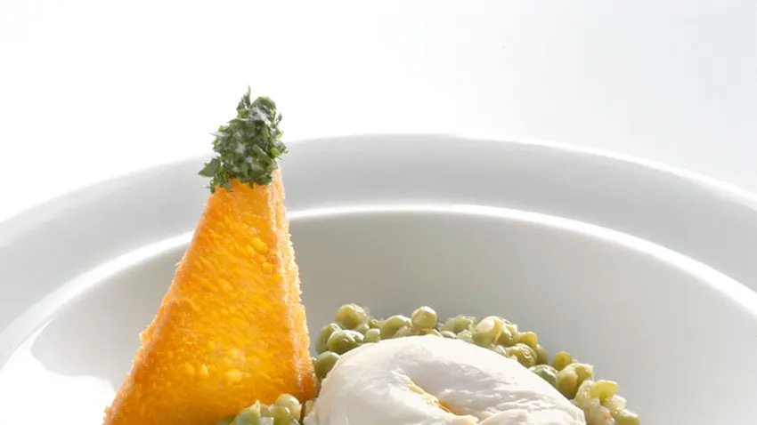 Rica y sencilla receta de guisantes con huevos escalfados y pan frito de Karlos Arguiñano.