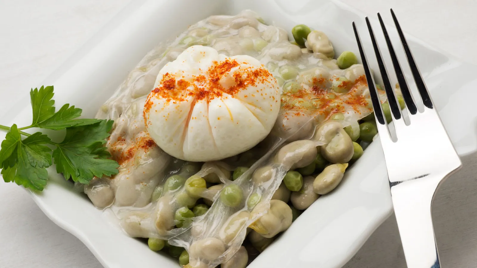 Receta de Karlos Arguiñano de habas y guisantes cubiertos con tocino y acompañados de huevo escalfado.