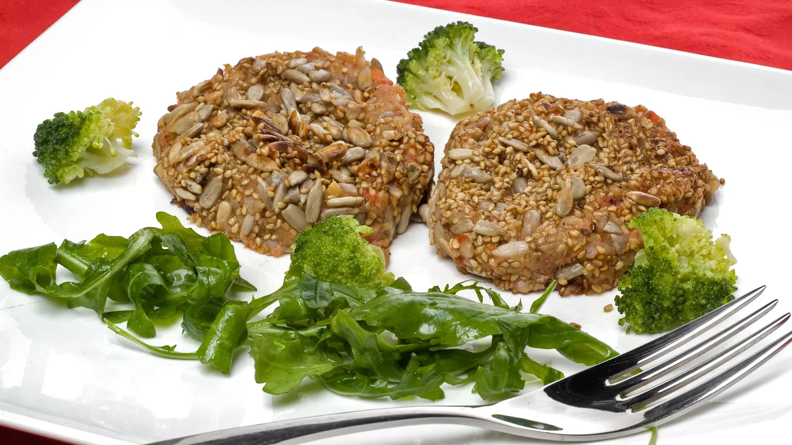 Hamburguesas vegetales con ensalada de rúcula y brócoli