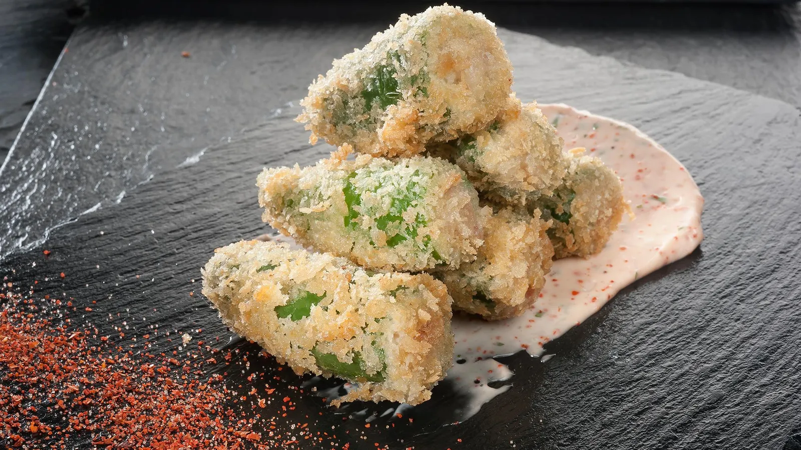 Pásalos por harina, huevo y panko. Fríelos en abundante aceite de oliva. Escúrrelos en papel absorbente. Mezcla la mahonesa con una pizca de chile en polvo, unas gotitas de limón y un poco de perejil picado.